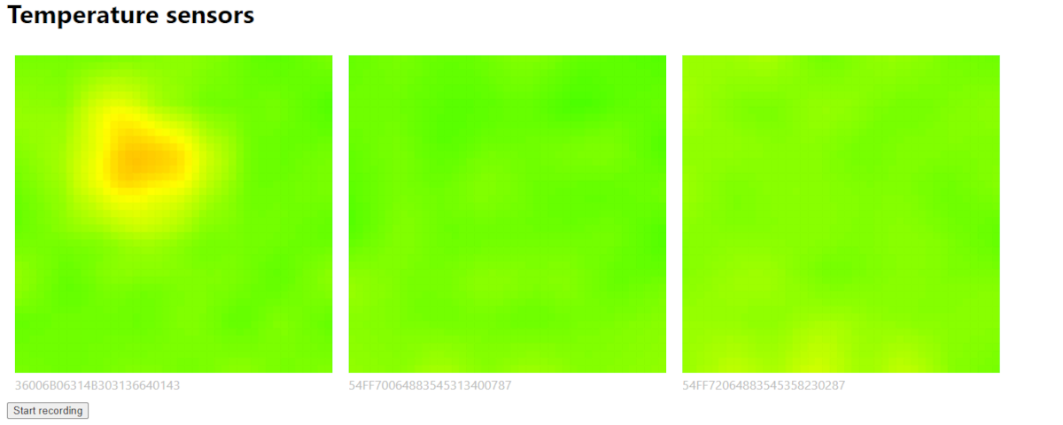 I wrote a PC application in JavaScript to interface with the devices. The application consists of two parts, a backend running on NodeJS and a frontend running in the web browser. On startup, the backend polls all connected serial ports to find any connected thermopiles. Each device has its own unique ID allowing for multiple to be connected at the same time. When data arrives from a device, it is forwarded to the GUI over a WebSocket. If a recording has been started, the data is also saved to a text file. The frontend uses React and allows for viewing of data from the devices in real time, as well as beginning and ending recordings.